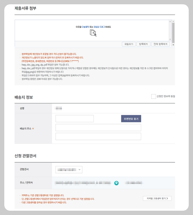카드발급신청 - 카드발급 지원대상 확인 - (실직자라면 (고용보험미가입자) 워크넷 구직등록) - 카드종류 및 본인계좌 선택 - 택배수령 또는 방문수령 선택 (은행 방문하면 당일 카드수령 가능함, 이때 카드발급신청서와 신분증 지참 필수)
