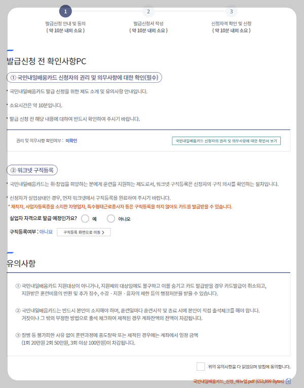 직업훈련에서 내일 배움 카드 발급신청을 선택하시면 아래 화면이 나옵니다.