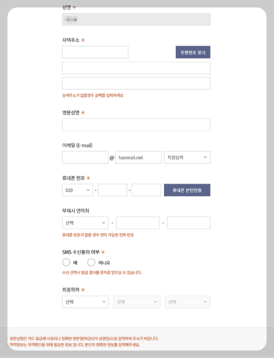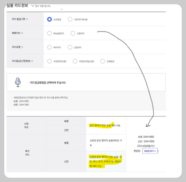 실물카드정보는 내 명의로 된 통장 중에서 집에서 가까운 영업점을 검색해 보고 농협카드나 신한카드를 선택하시면 됩니다.