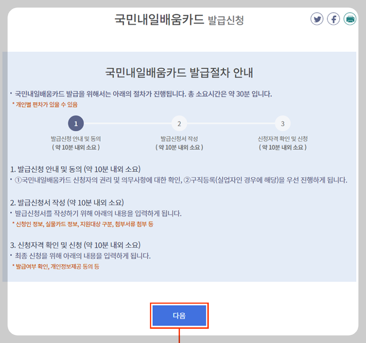 위의 카드발급 순서대로 세부사항을 안내해 드리니 보시고 따라 하시면 쉽게 내일 배움 카드 발급을 하실 수 있습니다.