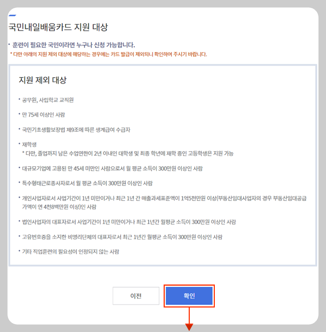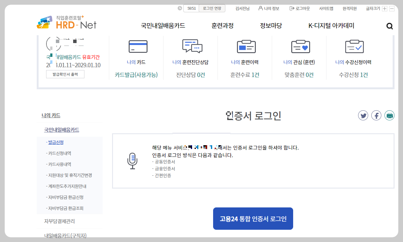 직업훈련에서 내일 배움 카드 발급신청을 선택하시면 아래 화면이 나옵니다.